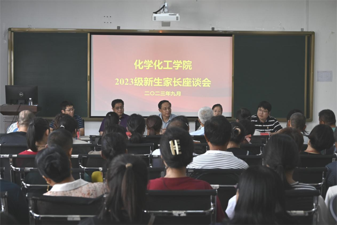 9月2日下午,化学化工学院在13号教学楼404会议室举办2023级新生家长座谈会,学院党委书记王介忠,院长杨乃涛,副院长周晋,黄昊飞出席,2023级新生家长参加座谈会,党委副书记牟海萍主持会议。