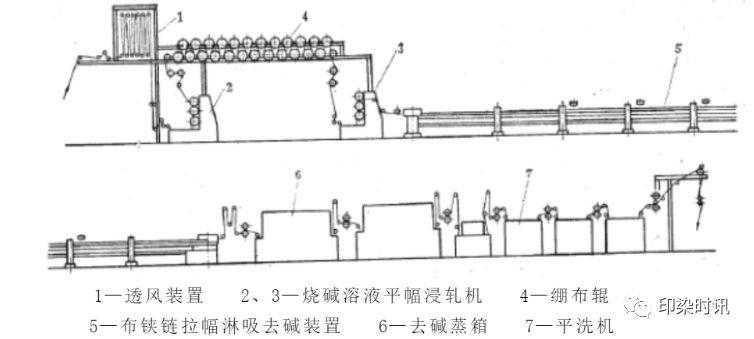 平幅进布装置→头道浸轧机→绷布辊筒→二道浸轧机→布铗扩幅装置→冲洗吸碱装置→去碱蒸箱→平洗机→(烘筒烘燥机)→出布。