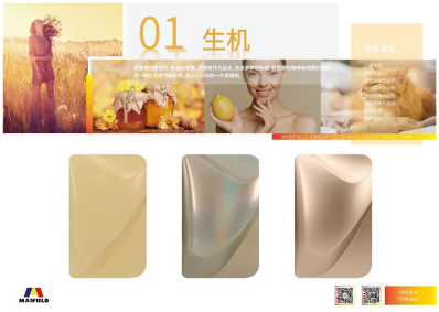 “金色”代表一个新的社会阶层,以及这个时代的主流审美价值观, 兼具优雅魅力,细腻而丰富。本系列颜色中,我们结合了更丰富的工艺手法,如PVD、光学镀、珠光喷涂、银粉喷涂等,表现出完全不同的质感与色泽。创造出一组富含品质感、绽放时尚能量的颜色。