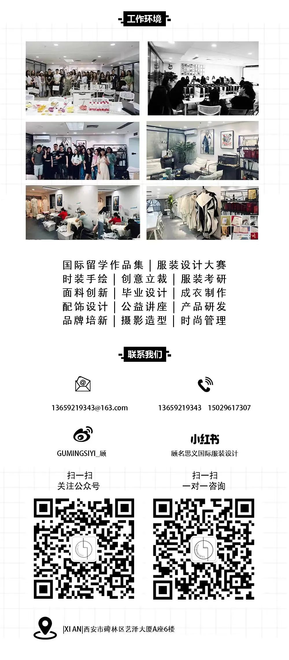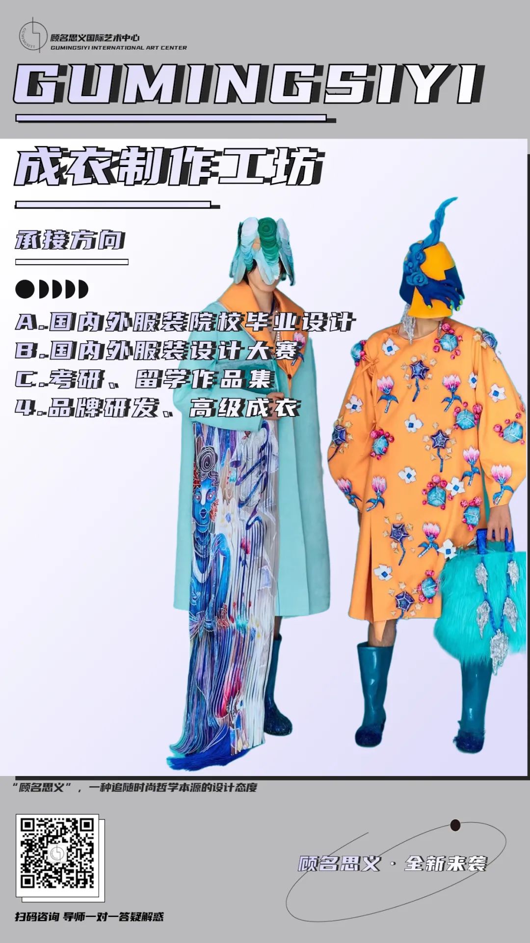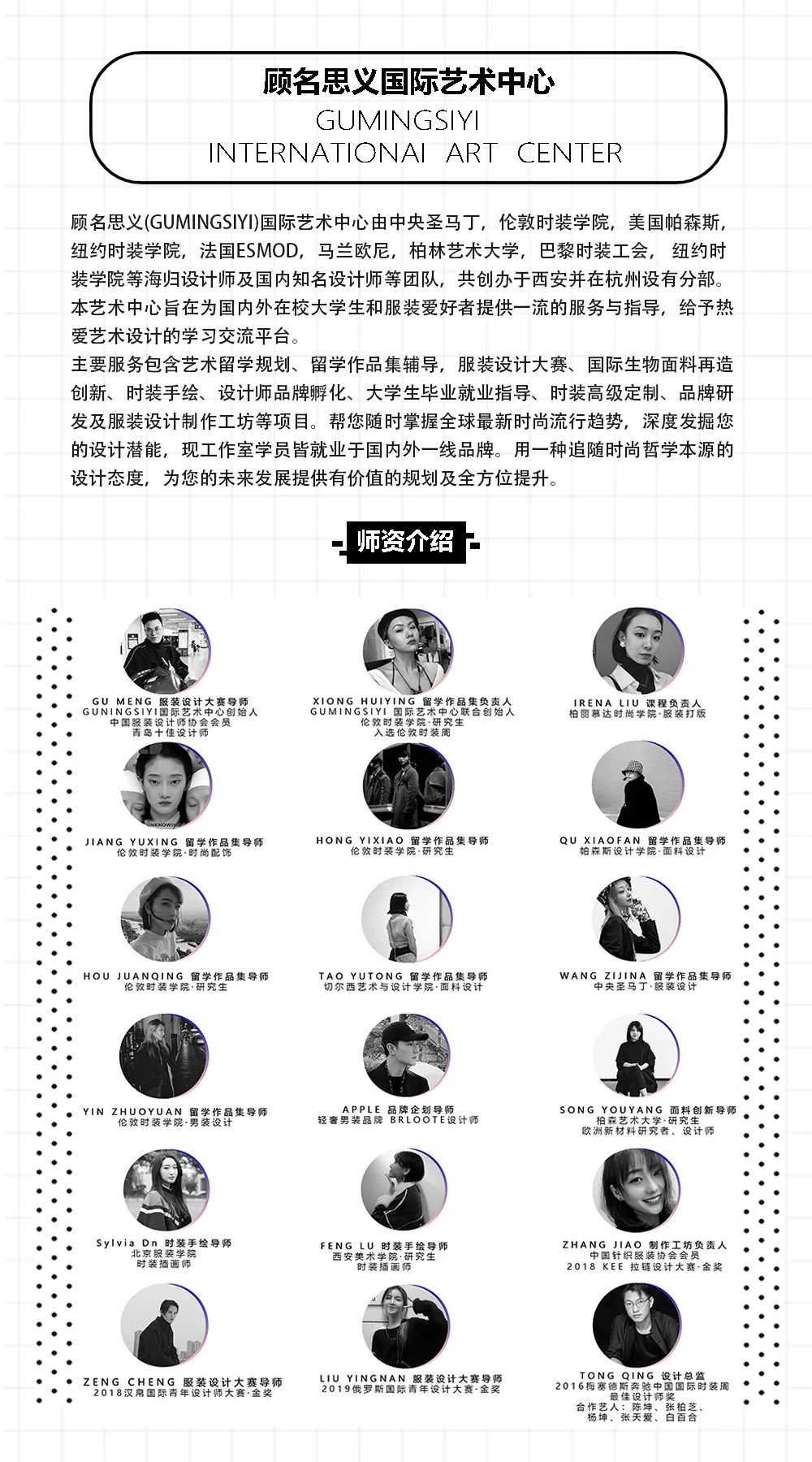 顾名思义(GUMINGSIYI)国际艺术中心由中央圣马丁、伦敦时装学院、美国帕森斯、纽约时装学院、法国ESMOD、马兰欧尼、柏林艺术大学、巴黎时装工会、纽约时装学院等海归设计师及国内知名设计师团队共同创办。