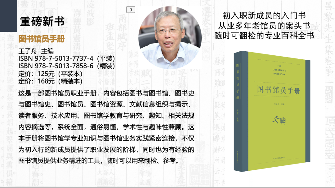 职业手册是人们在职场旅途的行进指南。这是一部图书馆员职业手册,内容包括图书与图书馆、图书史与图书馆史、图书馆员、图书馆资源、文献信息组织与揭示、读者服务、技术应用、图书馆学教育与研究、趣知、相关法规内容摘选等,系统全面,通俗易懂,学术性与趣味性兼顾。这本手册将图书馆学专业知识与图书馆业务实践紧密连接,不仅为初入行的新成员提供了职业发展的阶梯,同时也为有经验的图书馆员提供业务精进的工具,随时可以用来翻检、参考。