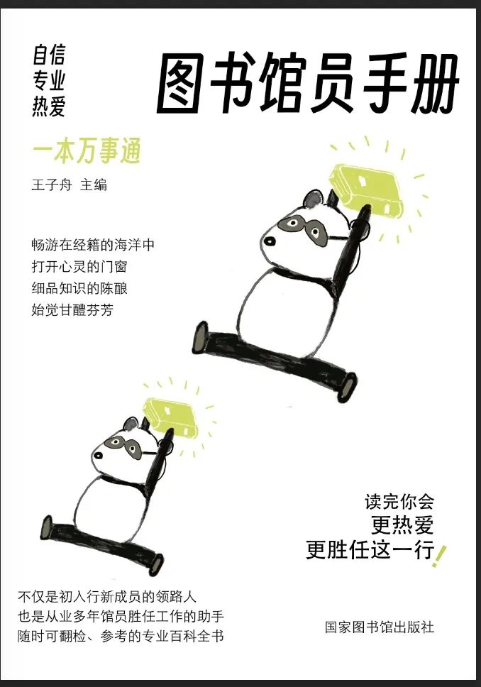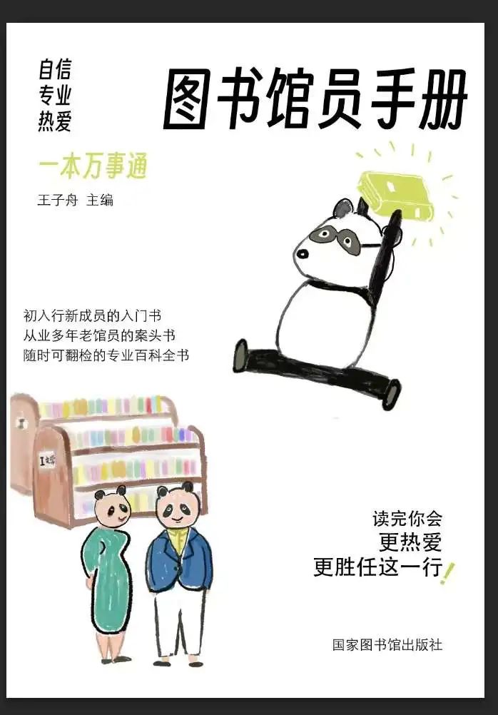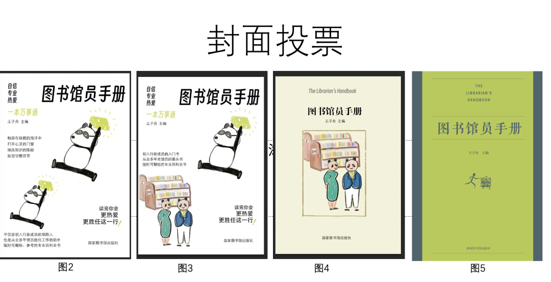 颜色配得还可以,但是英文书名显然太大了,另外就是可惜没有图书馆员的元素(只有一本书,书的含义比较宽泛)。有一次去机场,我看到一本畅销书,封面上面有很多花里胡哨的打动你的文字,还有一个简单有趣的人物。受此启发,责编我就用自己画过的熊猫馆员设计了几个封面。