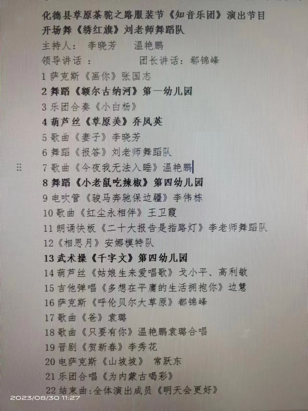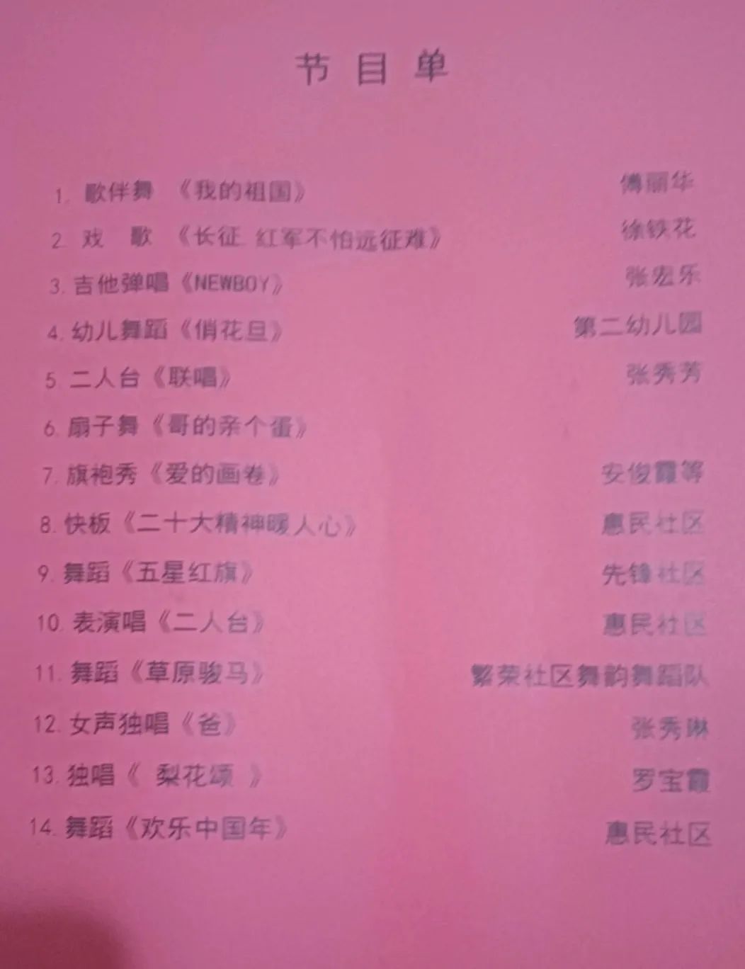 县文联音乐家协会副主席张弘乐的吉它弹唱《NEWGOY》、县文联音乐家协会副主席郗锦峰的萨克斯独奏《呼伦贝尔大草原》、县文联曲艺家协会主席张秀芳和赵登云的二人台《联唱》、县文联文艺志愿者李晓芳的歌曲《妻子》、县文联文艺志愿者袁璐的歌曲《爸》、县文联文艺志愿者李伟栋的电吹管《骏马奔驰保边疆》、文艺志愿者李秀花团队表演的舞蹈《二十大报告是指路灯》。