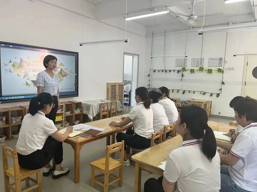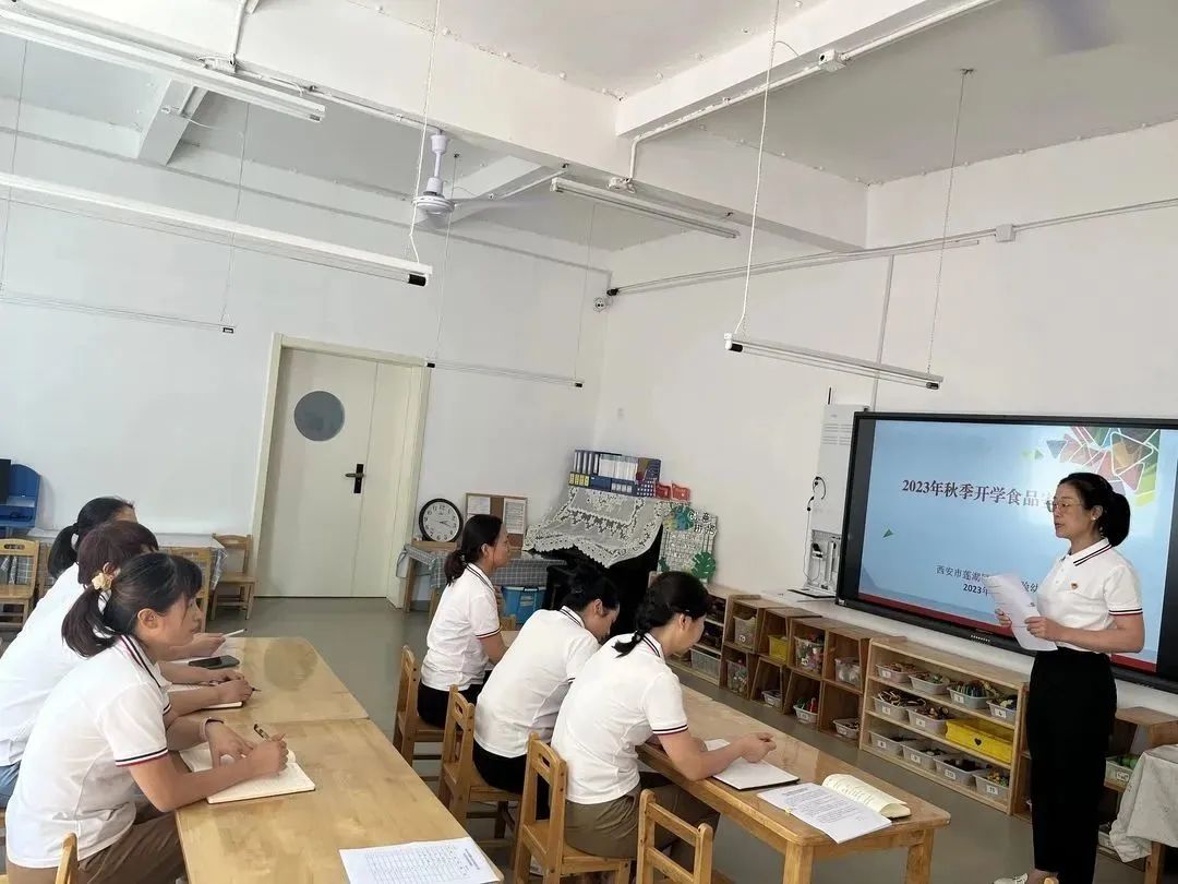 2023年8月31日下午,在食品安全专项培训中,食品安全总监、管理员及厨房操作人员学习了莲湖区市场监管局餐饮科《查错纠错 防患未然》食品安全培训会会议精神。高敏副园长就我园食品索证、采购、加工等安全管理细节,要求大家规范操作,严格把控食品安全各环节。后勤主任范老师针对食品出入库登记、留样柜登记及日常厨房清洁消毒登记记录等表格内容进行学习培训,双重监督管理下筑牢我园食品安全工作。