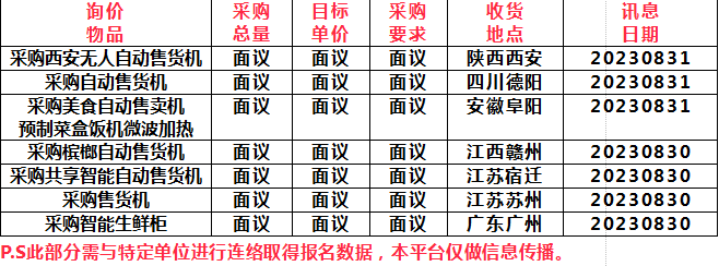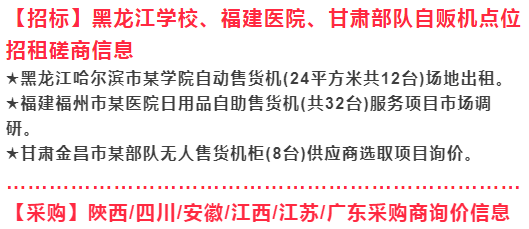 全国各地医院、学校、地(高)铁/汽车站、工业园、部队营区、景区/公园/服务站、电信单位政府部门、企业公司等单位需求自动售货机/咖啡机/自助服务设备项目招标案信息,更是日日刊载,满足许多业者知其然更进而参与竞标,紧抓商机。