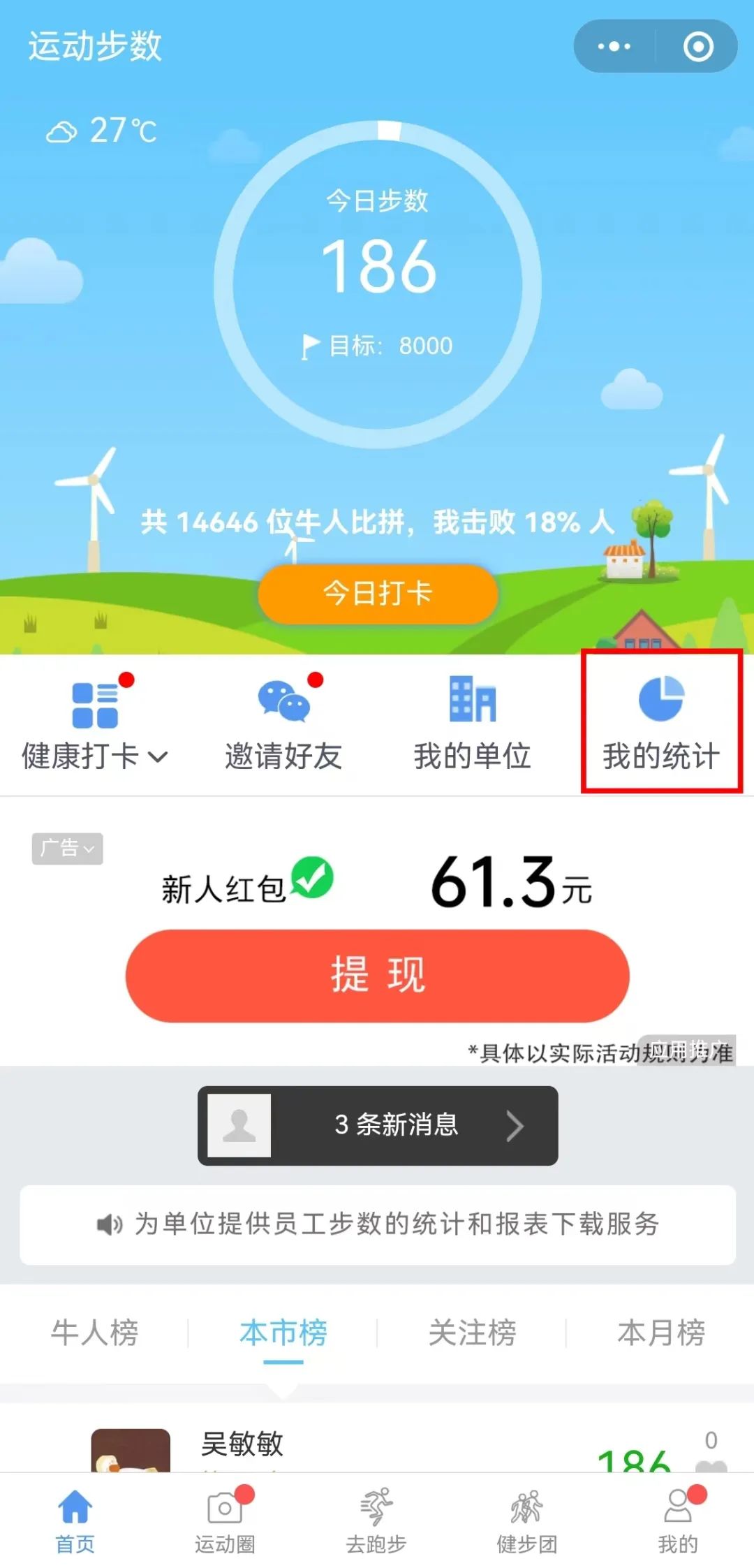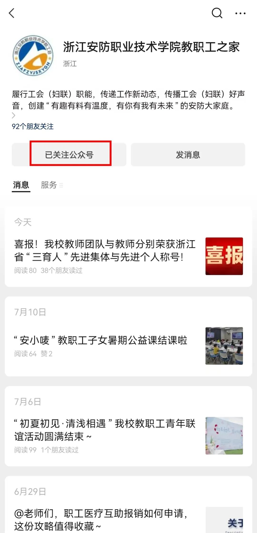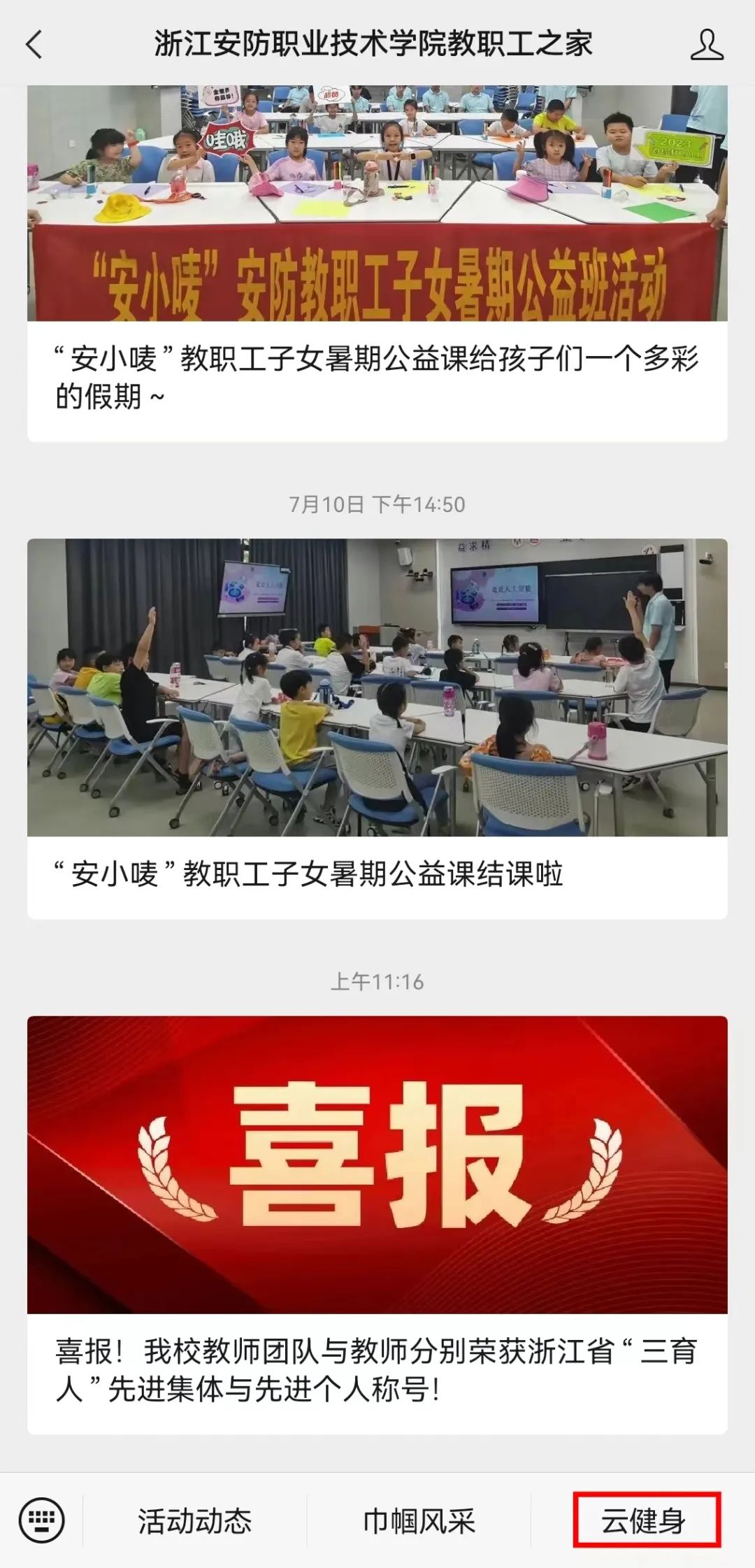 3、步数查看。关注“浙江安防职业技术学院教职工之家”公众号,点击“发消息”进入公众号内页并点击下方“云健身”,每日登陆“云健身”可查看今日打卡步数,进入“我的统计”则可查看活动期间“我的步数”,活动结束之后将活动期间的活动步数截图发送指定处。若无法显示步数,请同步开启微信运动。