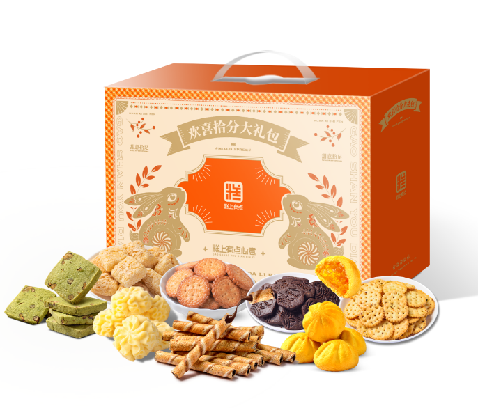 其中糕上有点欢喜拾分大礼包包含(黑巧克力夹心卷90g、薄脆奶盐日式小圆饼干130g、迷你火山曲奇型糕点(芒果味)120g、可可美式小饼干120g、小花曲奇饼干100g、蜜红豆抹茶曲奇120g、巧克力味燕麦酥120g、香葱薄饼干120g)