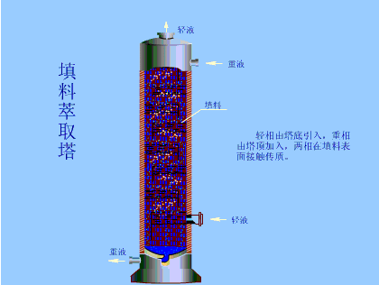 轻相由塔顶引入,重相由塔顶加入,两相在填料表面接触传质。