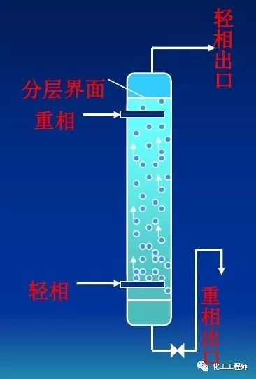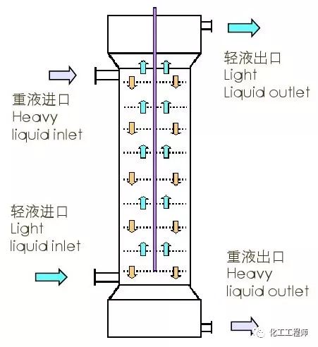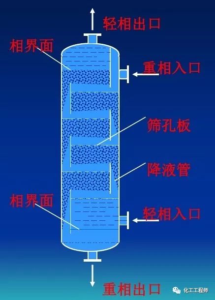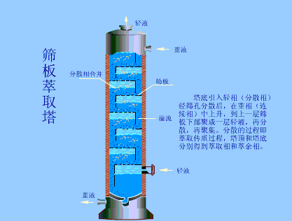 塔底引入轻相(分散相),经筛孔分散后,在重相(连续相)中上升,到上一层筛板下部聚集一层轻液,再分散,再聚集,分散的过程即萃取传质过程,塔顶和塔底分别得到萃取相和萃余相。
