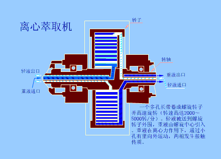 一个多孔长带卷成螺旋转子并高速旋转(转速高达2000-5000转/分),轻液被送到螺旋转子外围,重液在离心力作用下,通过小孔由里向外运行,两相发生接触传质。