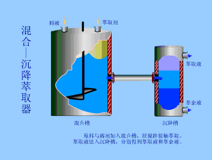 原料与溶剂加入混合槽,经搅拌接触萃取,萃取液送入沉降槽,分别得到萃取液和萃余液。