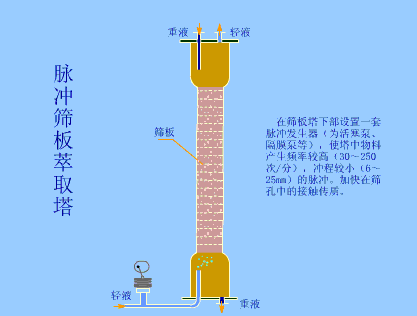 在筛板塔下部设置一套脉冲发生器(活塞泵、隔膜泵等),使塔中物料产生频率较高(30-250次/分) ,冲程较小(6-25mm)的脉冲,加快在筛孔中的接触传质。