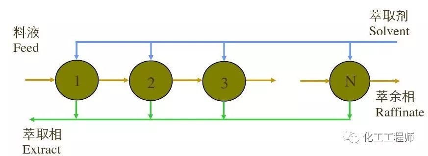 原料液一次通过各级、新鲜溶剂则分别介入各级的混合槽中,萃取相和最后一级的萃余相分分别进入溶剂回收设备,回收溶剂后的萃取相称为萃取液,回收溶剂后的萃余相称为萃余液。
