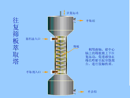 利用曲轴,使中心轴上的筛板做上下往复运动,促使液体在筛孔喷射引起分散混合,进行接触传质。