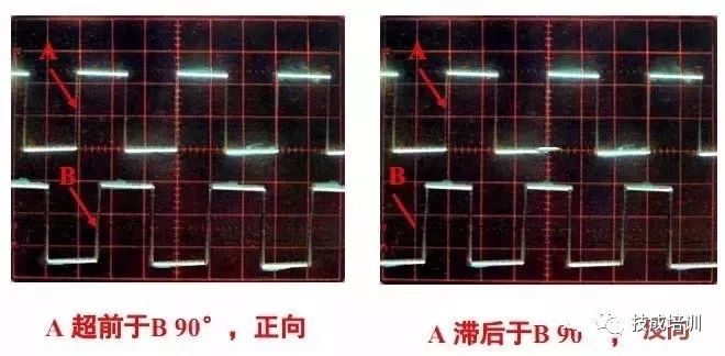 光敏元件所产生的信号A、B彼此相差 90°相位,用于辨向。当码盘正转时,A信号超前B信号0°;当码盘反转时,B信号超前A信号90°。