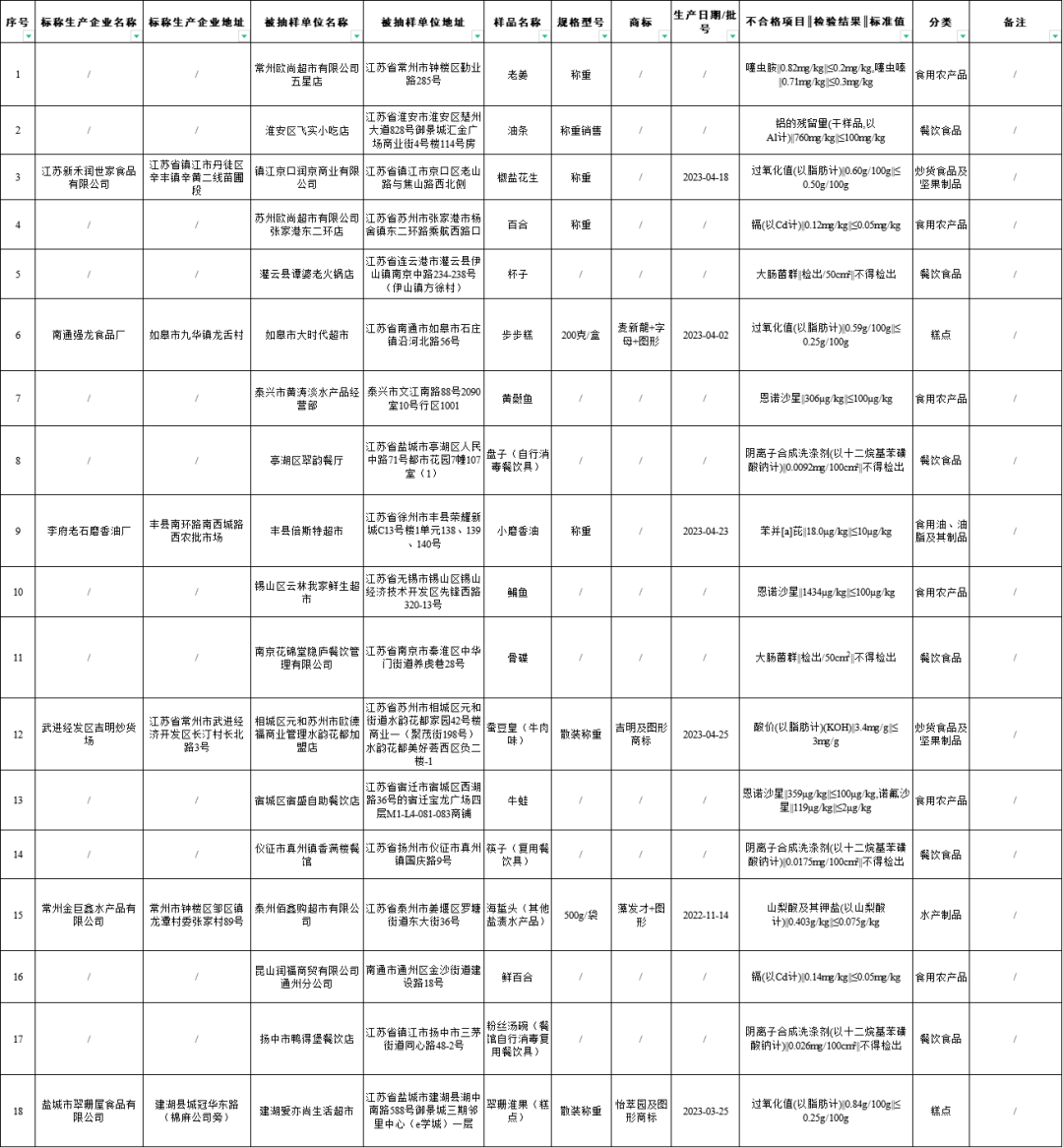 近期,江苏省市场监督管理局组织食品安全抽检,抽取糕点、食用农产品、炒货食品及坚果制品、餐饮食品、酒类、方便食品、肉制品、调味品、粮食加工品、饮料、茶叶及相关制品、蔬菜制品、食用油、油脂及其制品、可可及焙烤咖啡产品、淀粉及淀粉制品、水产制品和速冻食品等17大类食品731批次样品,检出餐饮食品、炒货食品及坚果制品、糕点、食用油、油脂及其制品、食用农产品和水产制品等6大类食品18批次样品不合格。具体情况通告如下: