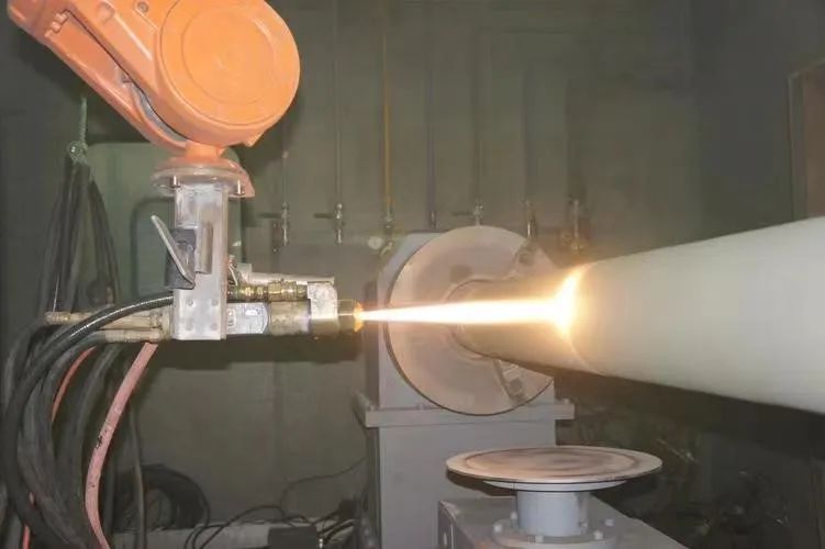 超音速喷涂是将粉末沿轴向或径向送入火焰,产生熔化或半熔化的粒子,高速(300~600m/s)撞击经过预处理的基体表面沉积形成涂层的一种方法,利用丙烷、丙烯等碳氢气等液体燃料,在燃烧室或特殊喷嘴内燃烧产生高压焰流,其温度为3200℃,火焰速度高达1500~2000m/s以上。