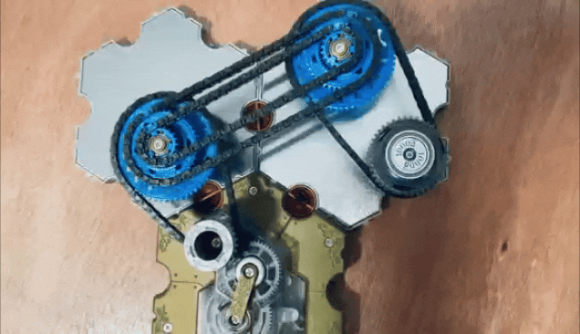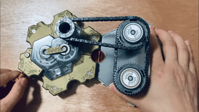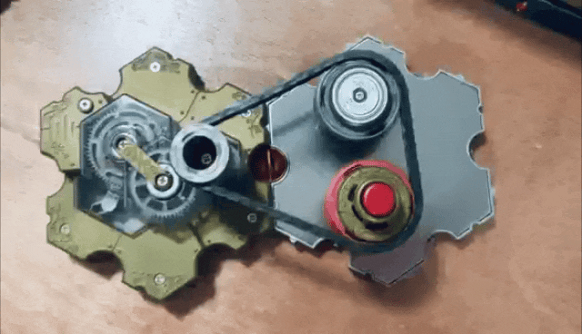 在下面的动图中,左边的是电池,右边的是两个电阻,一个有1000欧,一个500欧。当你拉动绳子,相当于对电池充电,松开绳子,电池放电,将能量消散到电阻中。这是一个串联电路。你可能已经看明白了,这个链条转动的速度就是电流的大小。当你串联几个电阻,链条转动的速度会更慢。