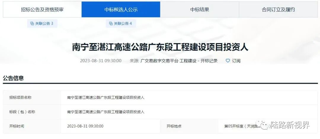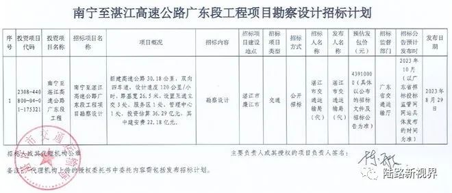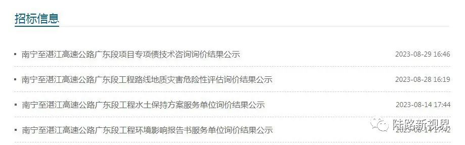 广东省公共资源交易中心平台消息:8月,南宁至湛江高速公路广东段工程建设项目前期工作取得重大进展,平台本月内累计发布了多条相关招标结果公告,其中项目投资中标候选人已于8月31日对外公示。另外,南宁至湛江高速公路广东段项目勘察设计招标计划也已公示,意味着广东段项目将进入工程初步设计阶段,为后续项目工程可行性研究报告的编制和评审过程提供重要的前置基础。