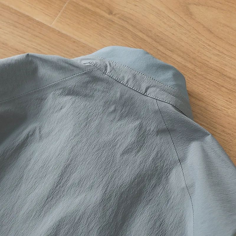 紧实细腻,光洁平滑,有微皱的小肌理,对于识货的兄弟,这面料一看就很不俗