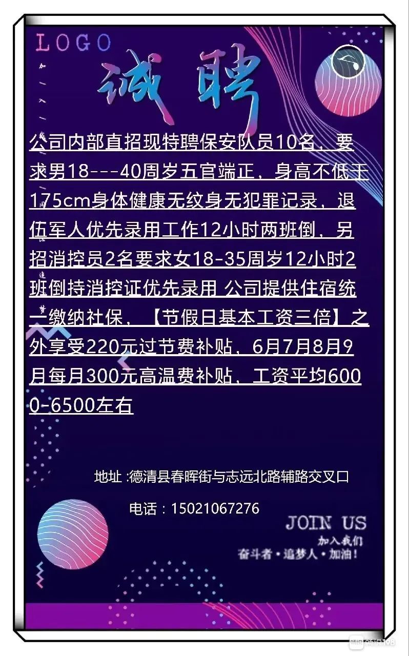 城南里丽园小区保安招聘:消控员:要求有国考证、秩序员要求:男性40周岁之内、12小时,月休四天,有法假、高温补贴、取暖补贴、包住有餐补、三节过节费,薪资5300-6000元,每月十号固定发放工资,公司直招非中介!