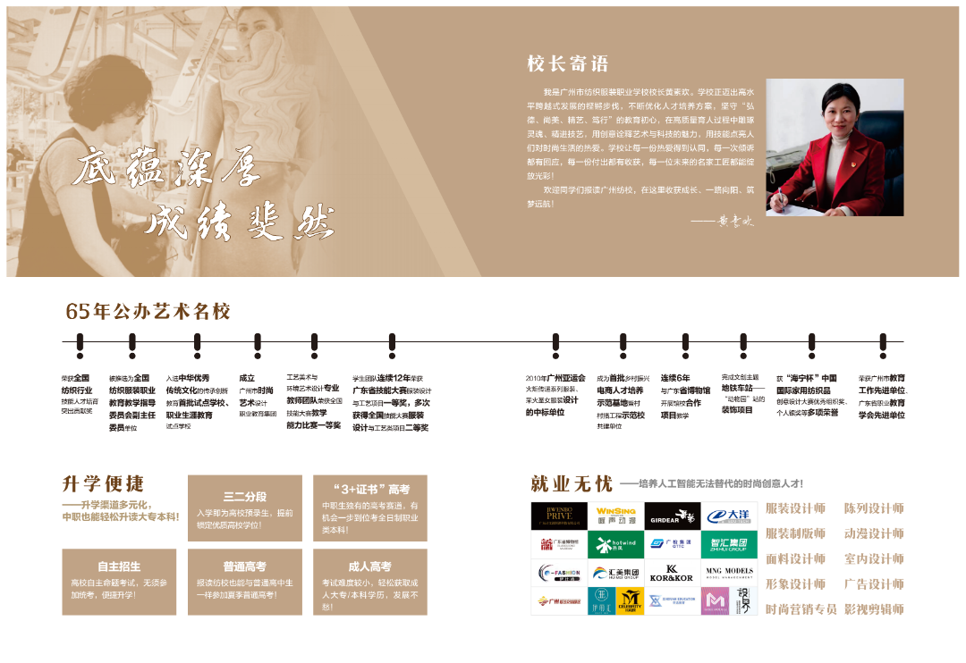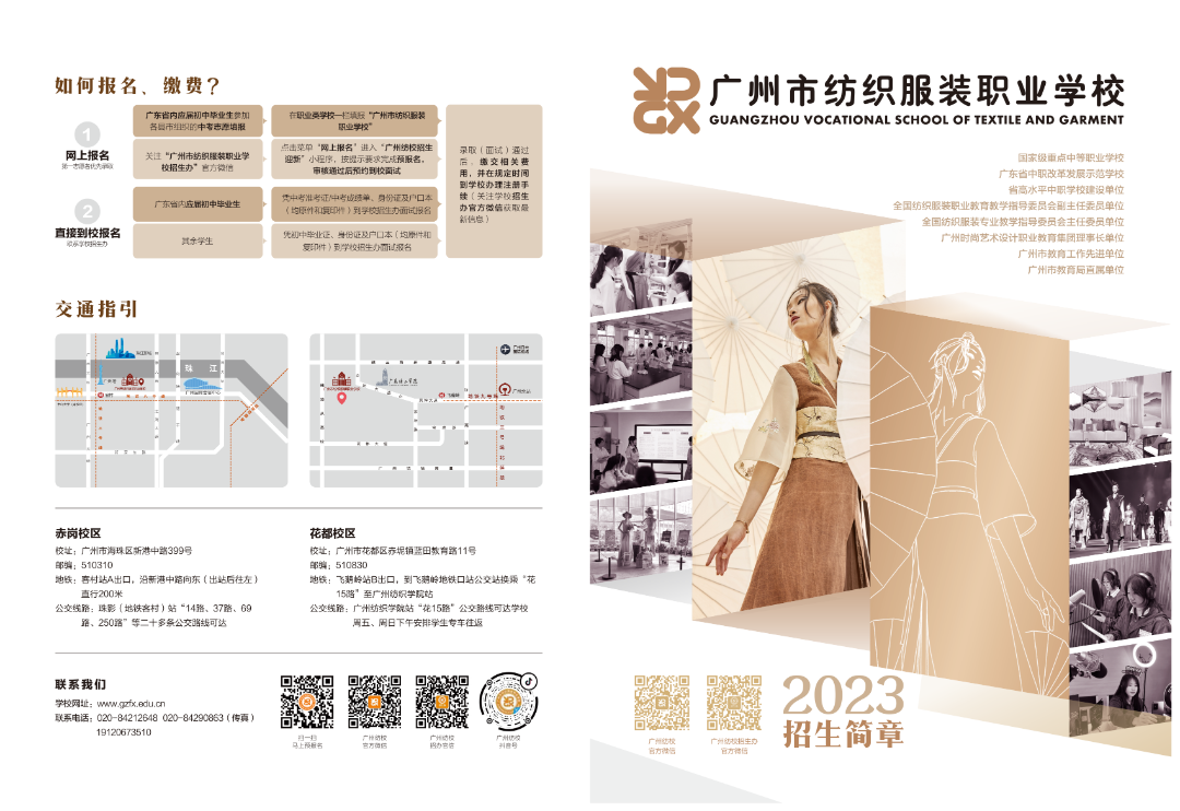 学校介绍 :广州市纺织服装职业学校创建于1958年,是国家级重点中等职业学校、省示范性中等职业学校,是广东省内中职教育服装类专业设置齐全、文化创意与艺术设计特色鲜明的艺术名校。