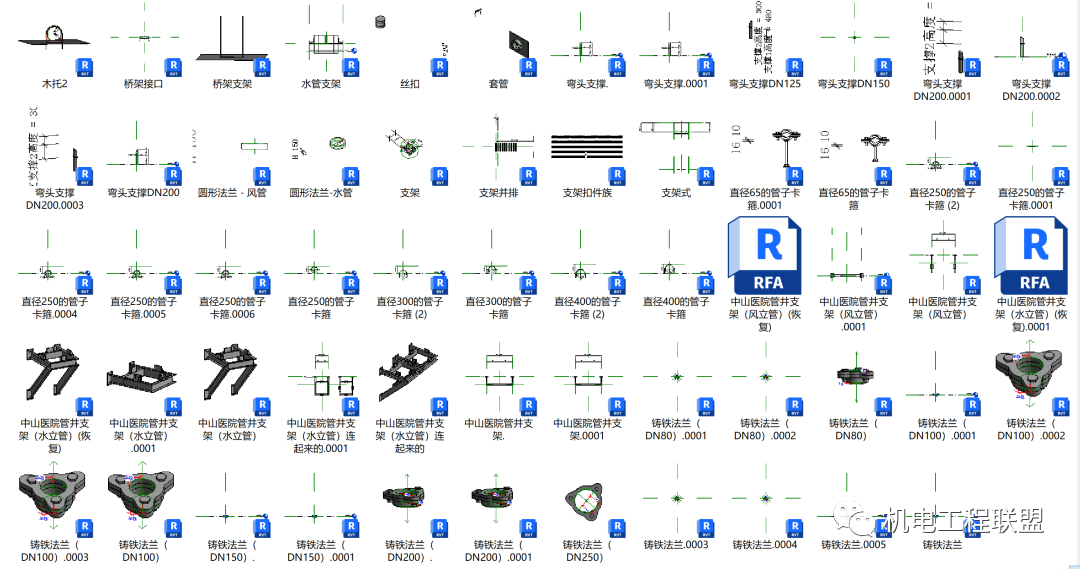 .rfa格式,包括各种型号槽钢、卡箍、套管、法兰、角钢、丝扣、接地扁钢、母线支架、桥架支架、水管、风管、弯头等常用Revit机电族库,现成的3D模型,构件齐全,方便建模出图,省时省力!