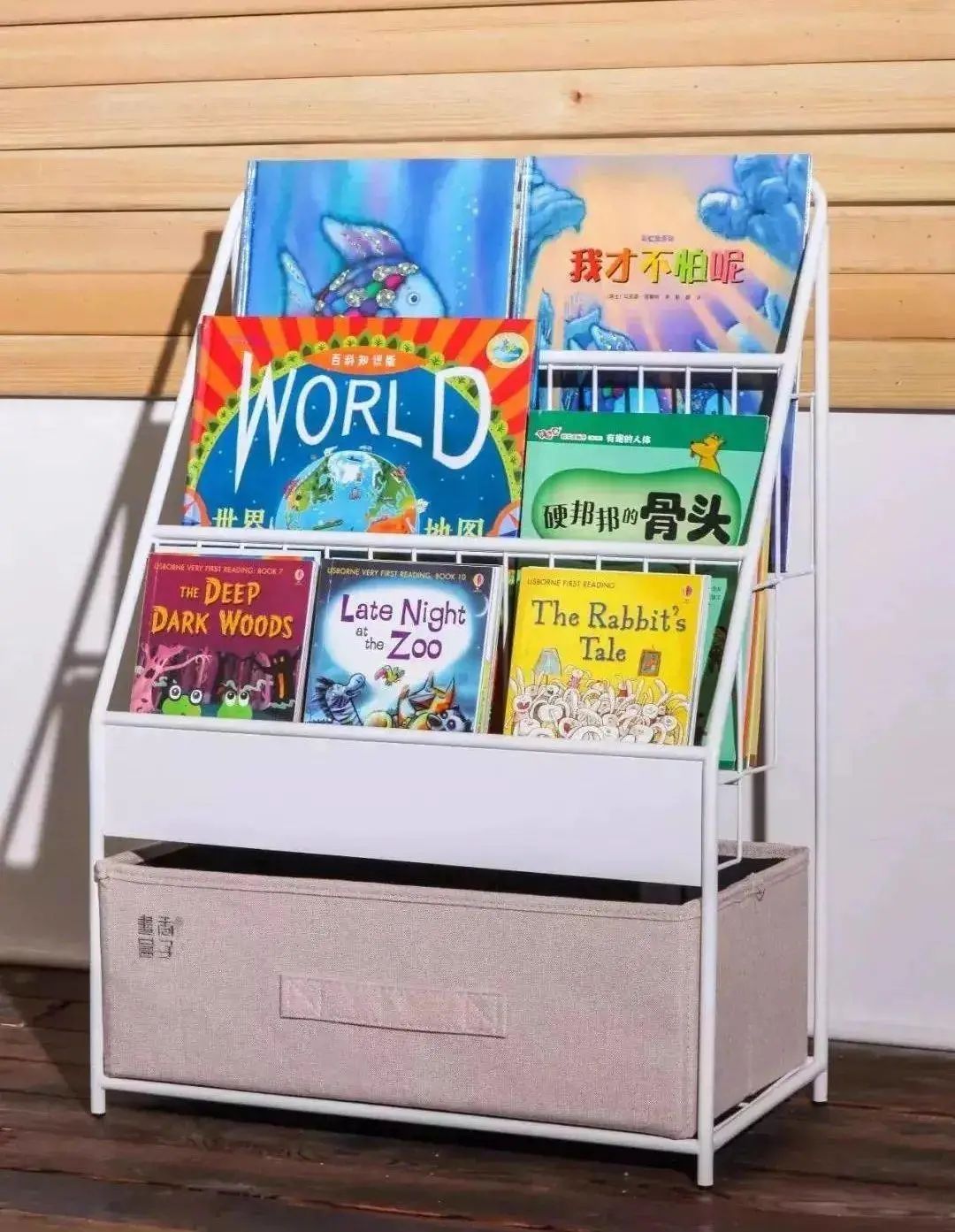家里的孩子比较小的话,建议家长可以把书籍绘本放在书架底部或者专门买一个矮角书架,高度适合孩子拿取,容量可观,结实耐用。