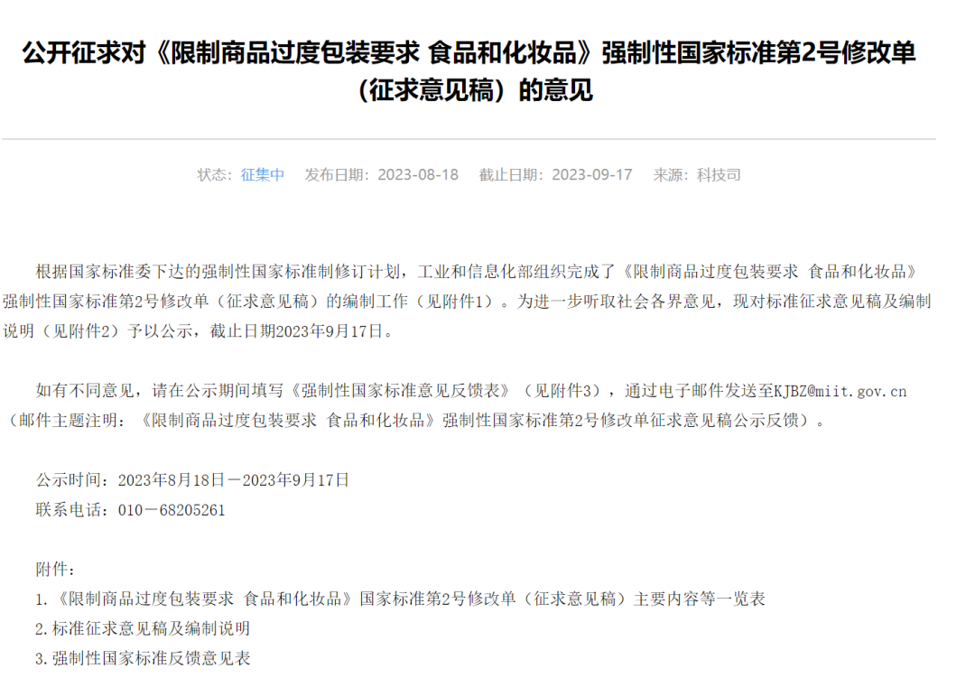 此国家强制性标准对食品和化妆品的过度包装进行了限制,严格规定了包装空隙率、包装层数和包装成本。此外,该强制性国家标准第2号修改单(征求意见稿)正在公示。