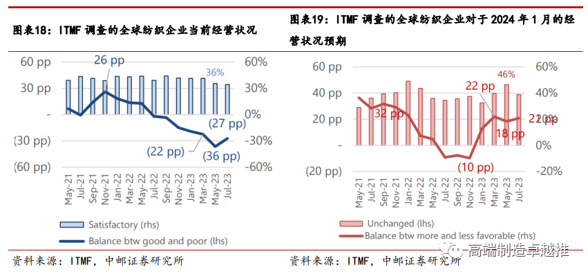 根据国际纺织制造商联合会调研数据,全球纺织业正逐步走出低谷,建议关注其持续性。根据国际纺织制造商联合会(ITMF)在 2023 年 7 月上半月进行的全球纺织行业调查(GTIS)显示,7 月全球纺织行业的平均经营状况有所改善,尽管仍然不容乐观,但是越来越多的纺织企业已经适应了恶劣的商业环境。服装、家纺和产业用纺织品生产商的订单量有了显著改善,南美和产业用纺织品的积压订单有所增加。调查显示,全球纺织业正逐步走出低谷,有望迎来企稳回升的积极势头。