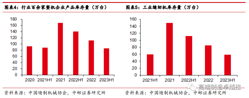 行业清库存成效显著,已基本回到2021H1水平。2023年6月末行业百家整机企业各类缝制设备库存量达86万台(其中,工业缝纫机库存58万台),同比下降36.88%,缝制设备与工业缝纫机库存量均已回到与2021H1相近的较低水平,行业清库减存成效明显。