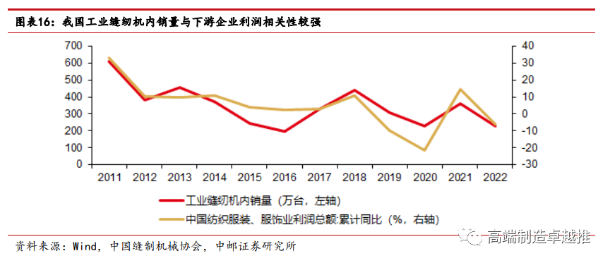 从数据来看,工业缝纫机的一轮周期通常为4年左右,其核心驱动因素为设备更新,动因包括主动(下游企业盈利能力)与被动(设备更新周期)。下游纺织企业盈利能力受到宏观经济、供需、库存等诸多因素影响,其盈利能力亦存在一定的波动性,会影响自身采购设备意愿。工业缝纫机内销量与中国纺织服装、服饰业利润总额的累计同比数据就表现出了较强的相关性。此外,工业缝纫机的更新周期为5-8年,若工业缝纫机工作年限过长,会影响产品的精度及稳定性,因而亦存在替换需求。