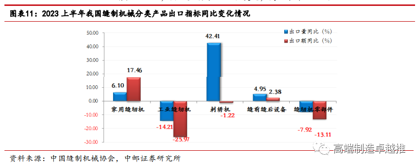 国内下游投资收紧,2023H1我国缝制设备内销同比普遍下降20-30%。上半年我国限额以上服装鞋帽针纺织品销售同比增长12.8%,下游鞋服等市场正在持续恢复,但受经济放缓、外部关系严峻以及产业链外迁等影响,我国服装生产、出口下行明显,下游行业规模紧缩,投资发展信心普遍不足,导致缝制设备内销持续低迷,市场没有出现明显反弹。据初步统计和各地调研显示,2023H1我国缝制设备内销同比普遍下降20-30%,而且低迷的趋势短期内仍在持续。