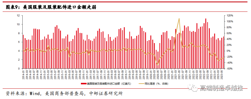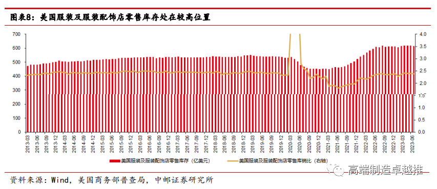 海外需求不振,出口高位回落,主因欧美鞋服库存仍待消化。据海关最新数据显示,上半年我国缝制机械产品出口额14.60亿美元,同比下降14.77%,降幅较一季度加深3.12个百分比,月出口额约回落至2021年水平,但仍明显好于2020年、2019年同期水平。俄罗斯、中西亚、南美部分区域市场对设备的需求依然较为旺盛,呈现出“服装内需型市场相对稳定,出口型市场下滑大”的特点,其核心原因为美国、欧盟、英国等受高库存影响服装进口同比下降平均超过10%。但是整体来看,总体来说,行业出口虽然从高位回落,但依然保持在一个相对较好的水平,呈现较大潜力和韧劲。