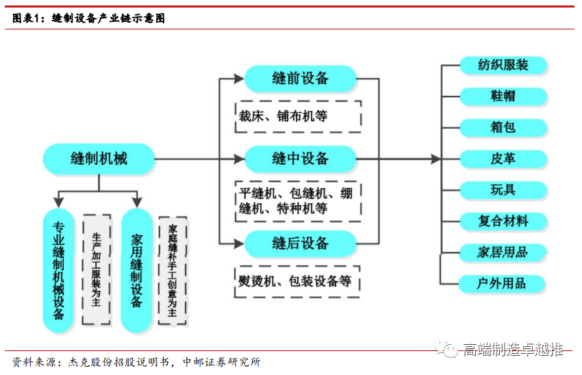 缝制机械行业是以生产缝纫机为主,裁剪、熨烫及粘合等机械为辅的专业设备制造业。缝制设备主要包括三大类:缝前设备、缝中设备和缝后设备。缝前设备主要包括裁床、铺布机等用于裁剪、铺开布料等缝纫前道工序的加工设备;缝中设备主要包括平缝机、包缝机、绷缝机和特种机等用于缝纫工序的加工设备;缝后设备主要包括熨烫、包装设备等用于熨烫、包装等服装生产后道工序的机械设备。