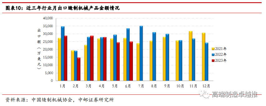 2023H1缝制设备内外市场恢复不及预期。国内下游投资收紧,2023H1我国缝制设备内销同比普遍下降20-30%。出口高位回落,主因欧美鞋服库存仍待消化,因而出口型市场下滑较大,但整体出口量依然保持在一个相对较好的水平。