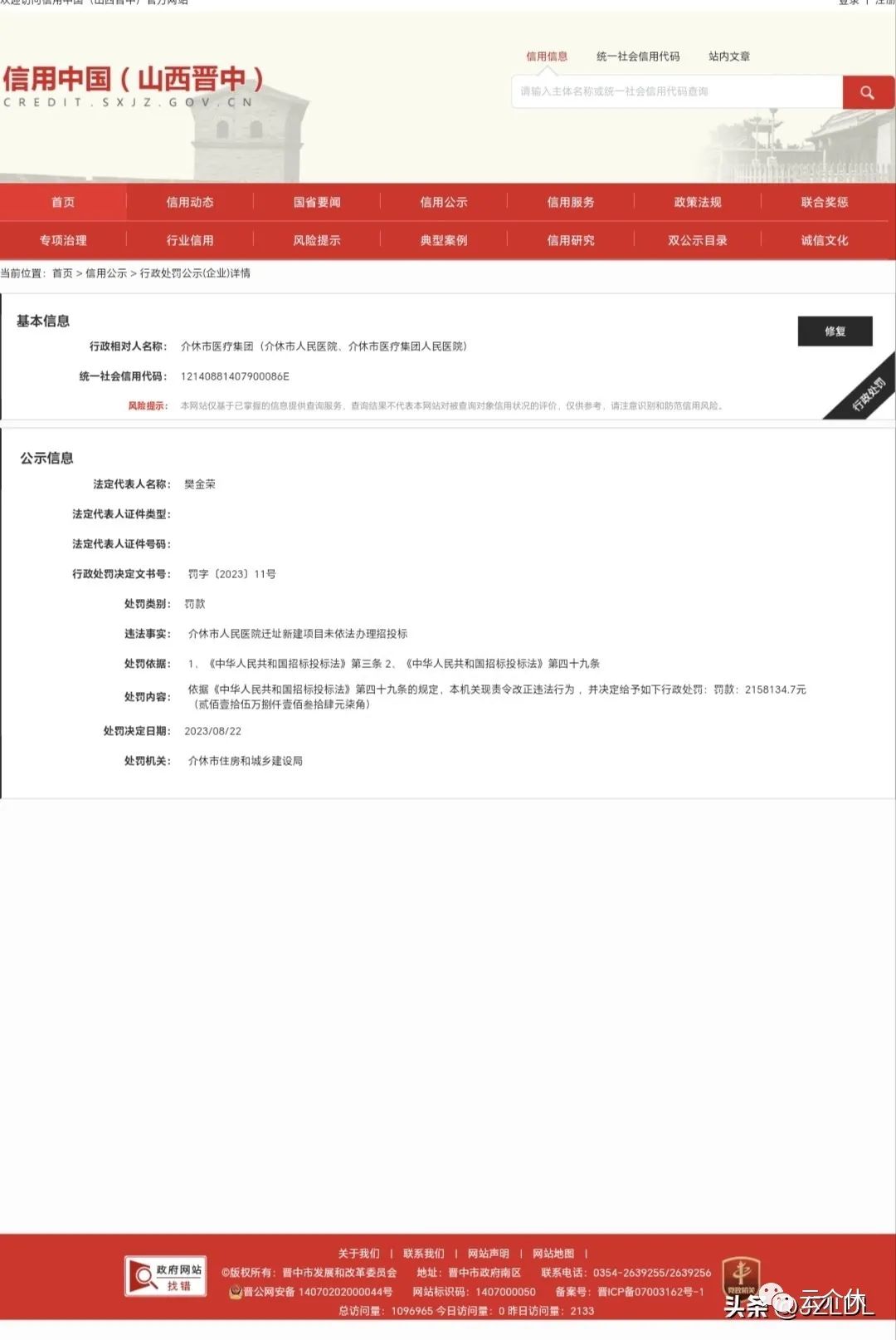 介休市医疗集团违反《中华人民共和国招标投标法》被处罚215万余元