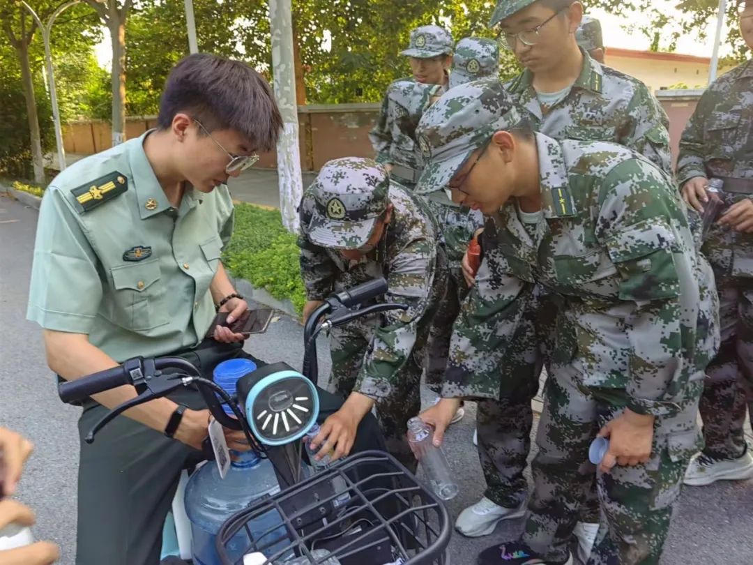 过草地,越壕沟,经历了长时间高强度的拉练,同学们垂首敛目,烈日之下,疲态难掩。见同学们体力不支,教官便让大家在道路两侧稍事休息,补充体力。正当同学们筋骨疲乏、口渴难忍之际,辅导员带着桶装水前来“救民于水火”。