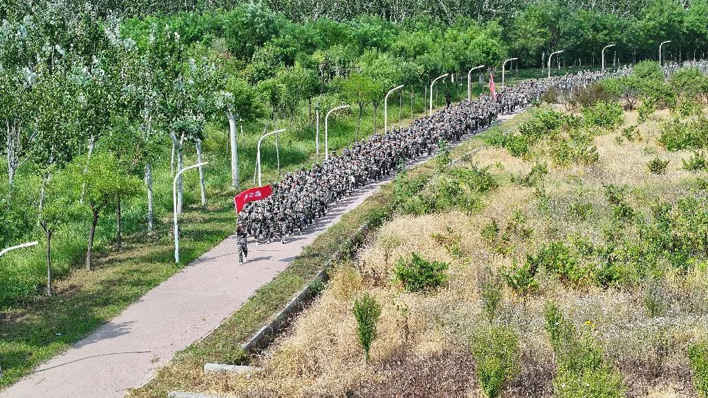 在行军之初,道路尚平整易行。天光云影浮,轻风穿林去。同学们眉宇间洋溢着兴致盎然,步伐齐整,一路高歌,气势如虹。“将士们,听党指挥,能打胜仗,作风优良!”鼓角喧喧,军歌声壮,峨峨兮若泰山,洋洋兮若江河。