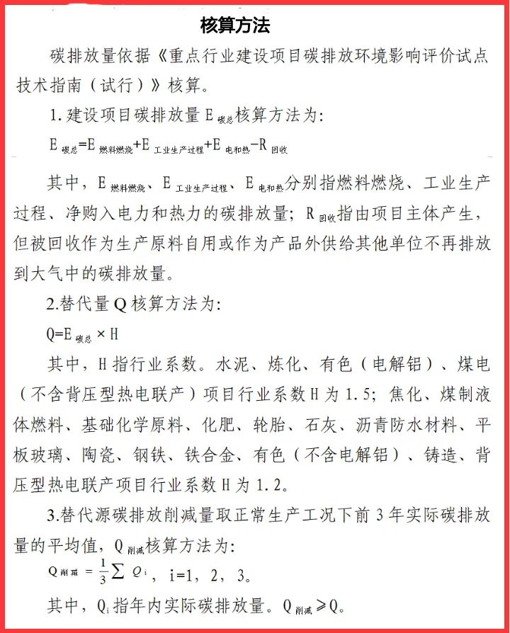 核算替代量时,替代量为建设项目碳排放量乘以行业系数。不同的行业碳排放系数不同,石化化工行业中,炼化项目行业系数为1.5;焦化、煤制液体燃料、基础化学原料、化肥、轮胎项目行业系数为1.2。