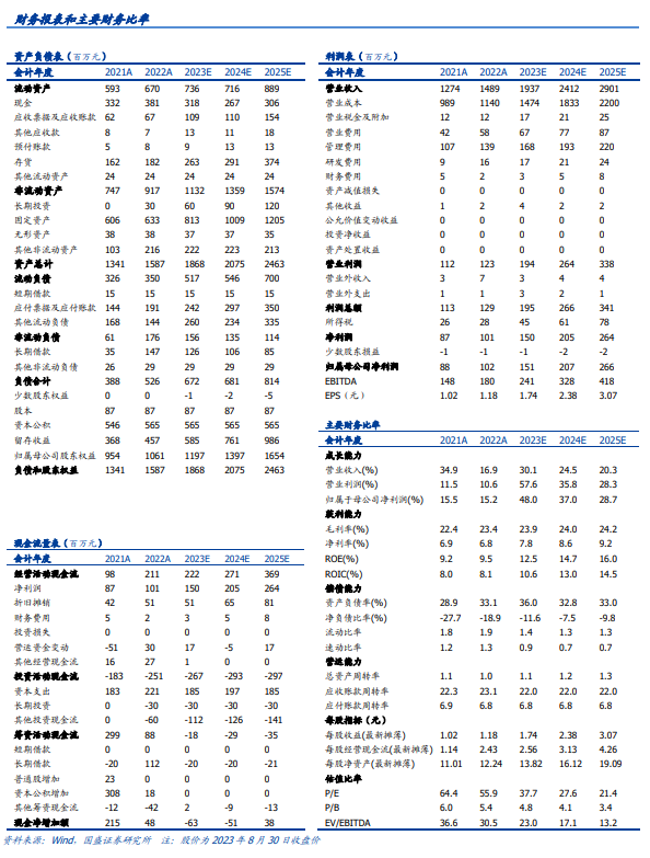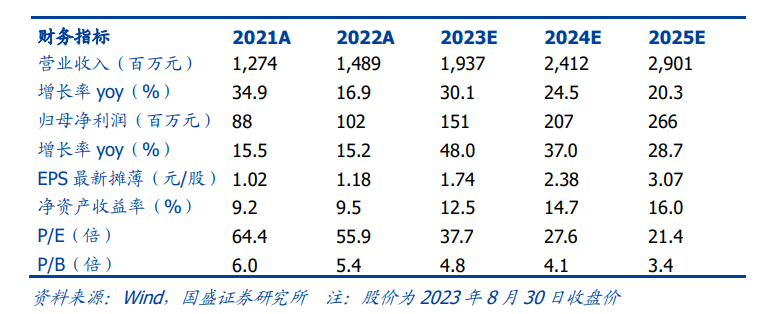 盈利预测:我们预计公司2023-2025年实现营收19.4/24.1/29.0亿元,同比增长30.1%/24.5%/20.3%,实现归母净利润1.5/2.1/2.7亿元,同比增长48.0%/37.0%/28.7%,对应PE38/28/21X。坚定看好公司长期成长空间以及短期基本面的高景气度,维持“买入”评级。