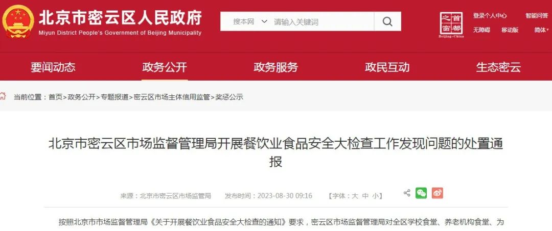 2023年8月30日,北京市密云区市场监督管理局发布开展餐饮业食品安全大检查工作发现问题的处置通报。北京市密云区市场监督管理局开展餐饮业食品安全大检查工作发现问题的处置通报按照北京市市场监督管理局《关于开展餐饮业食品安全大检查的通知》要求,密云区市场监督管理局对全区学校食堂、养老机构食堂、为学校供餐的集体用餐配送单位、品牌连锁餐饮单位以及诚信度低、有过违法记录的餐饮企业开展了2023年第十六期餐饮业食品安全大检查工作,现将检查工作发现问题的处置结果通报如下:1、北京北庄鹏成酒家未按规定定期维护、清洗、校验餐饮服务设施、设备的行为,违反了《中华人民共和国食品安全法》第五十六条第一款的规定,依据《中华人民共和国食品安全法》第一百二十六条第一款第(五)项的规定,给予警告。2、北京番字牌乡情民俗饭庄未建立食品安全日管控制度的行为,违反了《企业落实食品安全主体责任监督管理规定》第十一条的规定,依照《中华人民共和国食品安全法》第一百二十六条第一款的规定,给予警告。3、北京暖途小栈民俗饭庄未按规定定期维护、清洗、校验餐饮服务设施、设备的行为,违反了《中华人民共和国食品安全法》第五十六条第一款的规定,依据《中华人民共和国食品安全法》第一百二十六条第一款第(五)项的规定,给予警告。4、北京桂菊民俗饭庄未按规定定期维护、清洗、校验餐饮服务设施、设备的行为,违反了《中华人民共和国食品安全法》第五十六条第一款的规定,依据《中华人民共和国食品安全法》第一百二十六条第一款第(五)项的规定,给予警告。5、北京桂花民俗饭庄未保存记载有货物名称、数量、进货日期,以及供货者名称、地址、联系方式等内容的相关凭证的行为,违反了《北京市小规模食品生产经营管理规定》第十五条的规定,依据《北京市小规模食品生产经营管理规定》第二十八条的规定,给予责令改正。6、北京兴云居民俗饭庄未保存记载有货物名称、数量、进货日期,以及供货者名称、地址、联系方式等内容的相关凭证的行为,违反了《北京市小规模食品生产经营管理规定》第十五条的规定,依据《北京市小规模食品生产经营管理规定》第二十八条的规定,给予责令改正。7、北京志伟海丽小吃店未按规定定期维护、清洗、校验餐饮服务设施、设备的行为,违反了《中华人民共和国食品安全法》第五十六条第一款的规定,依据《中华人民共和国食品安全法》第一百二十六条第一款第(五)项的规定,给予警告。8、北京李大福馒头店未按规定定期维护、清洗、校验餐饮服务设施、设备的行为,违反了《中华人民共和国食品安全法》第五十六条第一款的规定,依据《中华人民共和国食品安全法》第一百二十六条第一款第(五)项的规定,给予警告。9、北京密水渔业开发有限公司未主动对消费者进行防止食品浪费提示提醒的行为,违反了《中华人民共和国反食品浪费法》第七条第一款第(二)项的规定,依据《中华人民共和国反食品浪费法》第二十八条第一款的规定,给予警告。10、北京京太欣蕊小吃店未建立食品安全日管控制度的行为,违反了《企业落实食品安全主体责任监督管理规定》第十一条的规定,依照《中华人民共和国食品安全法》第一百二十六条第一款的规定,给予警告。11、北京康红霞饸饹店餐具、饮具和盛放直接入口食品的容器使用前未洗净、消毒的行为,违反了《北京市小规模食品生产经营管理规定》第十八条第(四)项的规定,依据《北京市小规模食品生产经营管理规定》第二十八条的规定,给予责令改正。12、北京同聚来酒家餐具、饮具和盛放直接入口食品的容器使用前未洗净、消毒的行为,违反了《北京市小规模食品生产经营管理规定》第十八条第(四)项的规定,依据《北京市小规模食品生产经营管理规定》第二十八条的规定,给予责令改正。13、北京圆隆鑫食府未按规定定期维护、清洗、校验餐饮服务设施、设备的行为,违反了《中华人民共和国食品安全法》第五十六条第一款的规定,依据《中华人民共和国食品安全法》第一百二十六条第一款第(五)项的规定,给予警告。14、北京冬丽浩霖小吃店未主动对消费者进行防止食品浪费提示提醒的行为,违反了《中华人民共和国反食品浪费法》第七条第一款第(二)项的规定,依据《中华人民共和国反食品浪费法》第二十八条第一款的规定,给予警告。15、北京福全乾坤民俗饭庄未按规定定期维护、清洗、校验餐饮服务设施、设备的行为,违反了《中华人民共和国食品安全法》第五十六条第一款的规定,依据《中华人民共和国食品安全法》第一百二十六条第一款第(五)项的规定,给予警告。16、北京刚好遇到你民俗饭庄未在经营场所显著位置公示从业人员健康证明的行为,违反了《北京市小规模食品生产经营管理规定》第十四条的规定,依据《北京市小规模食品生产经营管理规定》第二十九条的规定,给予责令改正。17、北京新城子梦缘民俗饭庄未按规定定期维护、清洗、校验餐饮服务设施、设备的行为,违反了《中华人民共和国食品安全法》第五十六条第一款的规定,依据《中华人民共和国食品安全法》第一百二十六条第一款第(五)项的规定,给予警告。18、北京金佳香餐饮管理有限公司未按规定定期维护、清洗、