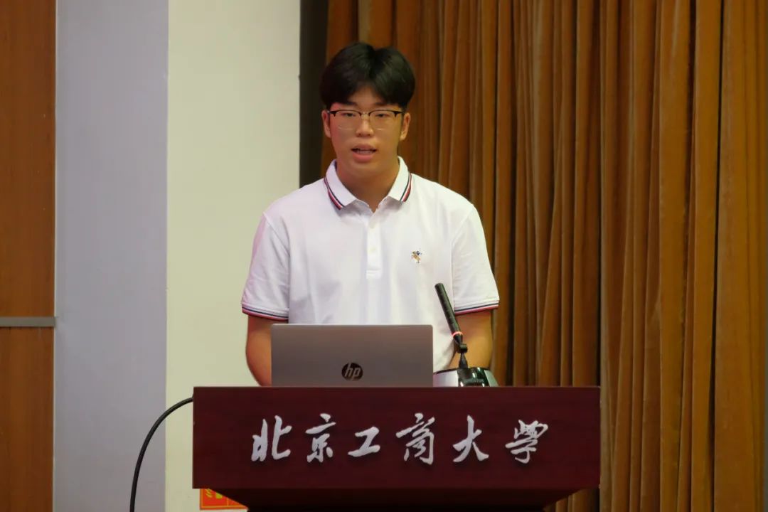 接着,食品23中外班鲁健代表新生发言。他回首了高中三年拼搏的岁月和填报志愿时选择北京工商大学食品科学与工程专业时的坚定。作为新生,他分享了对大学生活的向往和憧憬,同时也明白要进行身份的转换,思维、言行、习惯的转变。他表示,作为青年人,应努力学习,积极进取,为振兴吾国之荣光,少年须遇事则刚;为少年鸿鹄之志向,吾辈须愤发图强。
