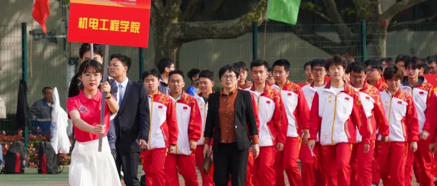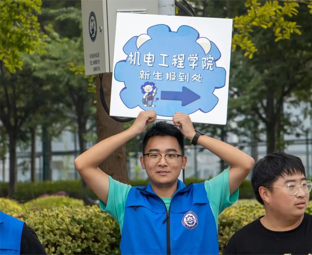 志愿者高举“机电工程学院”提示牌