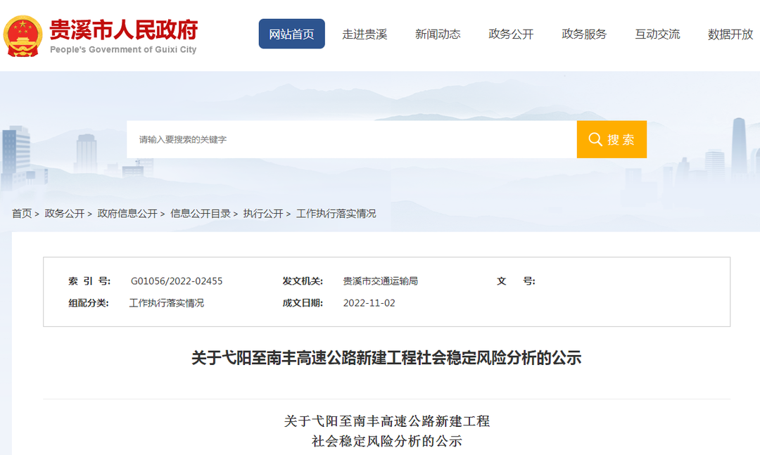 据2022年11月2日贵溪市人民政府发布的《关于弋阳至南丰高速公路新建工程社会稳定风险分析的公示》显示:弋阳至南丰高速公路新建工程项目建设地点位于江西省境内,涉及3市6县,分别为:上饶市弋阳县、鹰潭市贵溪市、抚州市资溪县、南城县、黎川县和南丰县。