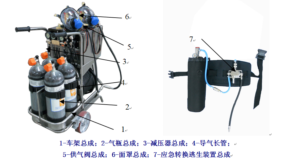 长管空气呼吸器由车架总成、气瓶总成、减压器总成、导气长管、供气阀总成、面罩总成和应急转换逃生装置总成七大部分组成,如下图所示。