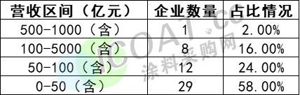 据不完全统计,在营业收入50强中,在500亿-1000亿(含)区间的仅有一家企业,占比2%,0-50亿(含)的企业有29家,占比高达58%。营收超过100亿的仅9家企业,占比不到2成,约6成上榜50强的化工企业营收在50亿(含)以下,金字塔效应明显。