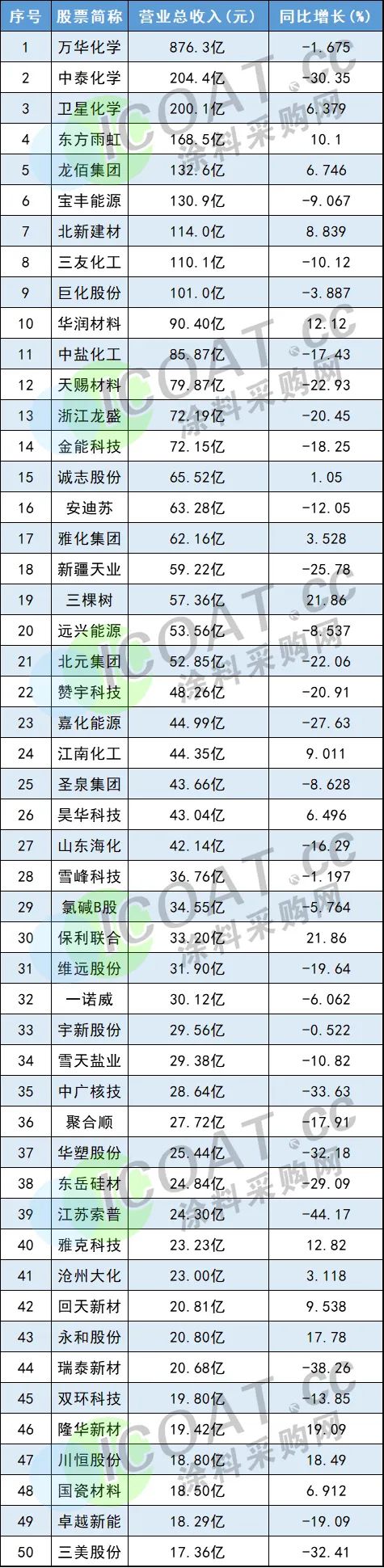 从营业收入情况来看,国内上市公司中,化工原料、化学制品等领域,营收50强TOP1为万华化学(876.3亿元),TOP2是中泰化学,TOP3是卫星化学,而作为“涂料一哥”的东方雨虹和亚洲最大钛白粉企业的龙佰集团,分别位列第四、第五位。