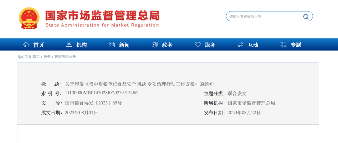 为进一步规范学校(含托幼机构,下同)、医院、养老院、机关等集中用餐单位食堂经营管理,防范化解风险隐患,全面提升集中用餐单位食品安全水平,近日,市场监管总局会同教育部、民政部、国家卫生健康委、国管局等相关部门决定自即日起至2023年年底,开展集中用餐单位食品安全问题专项治理行动。