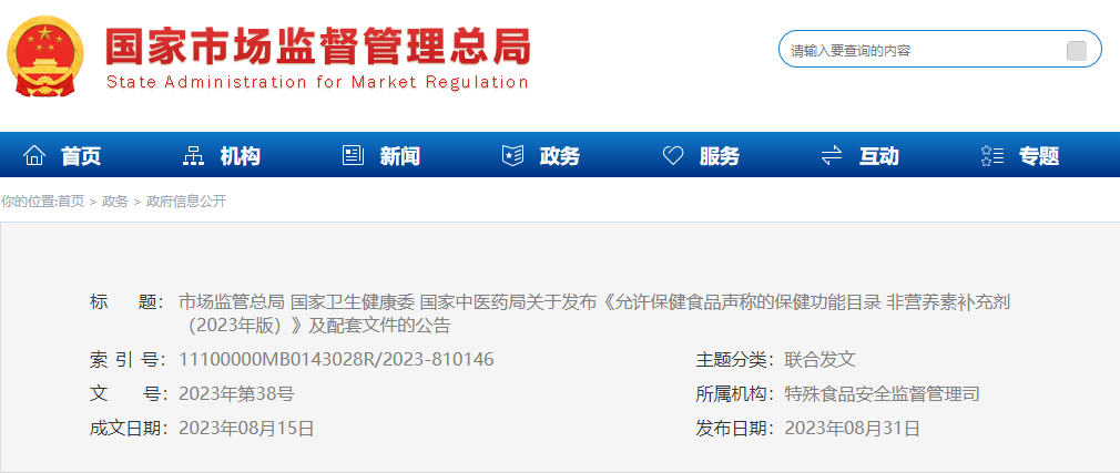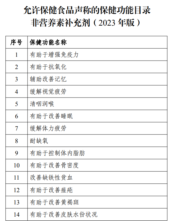 2023年8月31日,国家市场监管总局、国家卫生健康委、国家中医药局联合发布《允许保健食品声称的保健功能目录非营养素补充剂(2023年版)》及配套文件的公告。规范保健食品功能声称管理,落实企业保健功能声称和评价主体责任,促进产业创新和高质量发展。